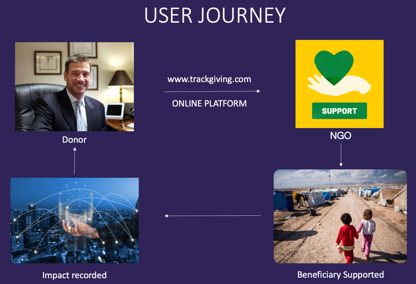 A Donor donates to the NGO via the online platform, which then supports beneficiaries.The impact of this process is recorded on a distributed ledger also known as the Blockchain, which then feedbacks to the donor.